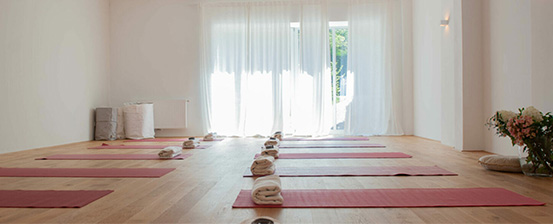 Dieser Raum (ca. 75 qm) bietet Platz für bis zu 20 Personen beim Yoga oder Pilates und bis zu 40 Personen für Vorträge und Seminare. Er verfügt über eine hochwertige Ausstattung und eine Fußbodenheizung.